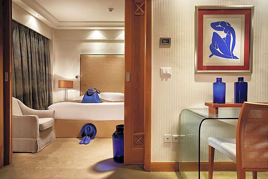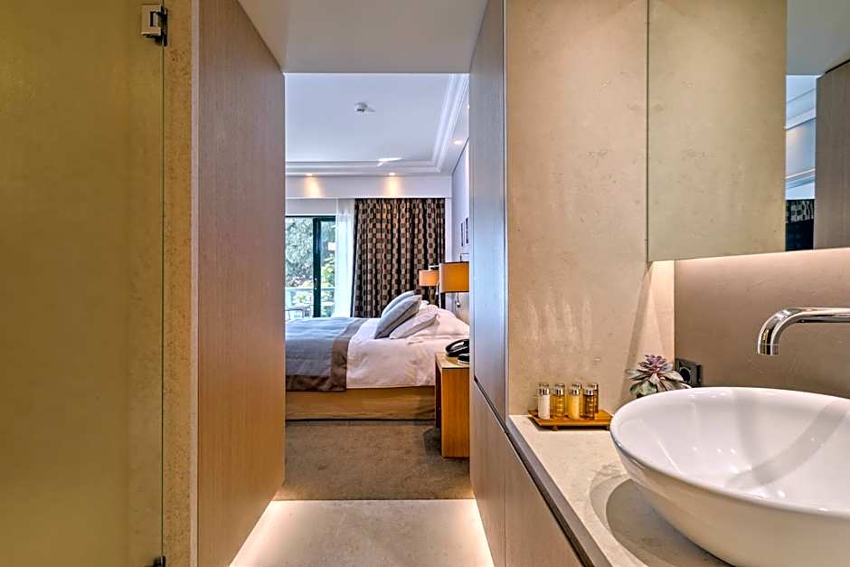 Very spacious suite with luxurious bathroom with spa bath and front-side view of the pool and the parks.